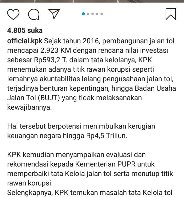 “Sejak tahun 2016, pembangunan jalan tol mencapai 2.923 KM, nilai investasi Rp593,2 T. KPK menemukan titik rawan korupsi yaitu lemahnya akuntabilitas lelang, benturan kepentingan dan BUJT tidak melaksanakan kewajiban.Hal tersebut berpotensi menimbulkan kerugian keuangan negara Rp4,5 Trilliun,” tulis KPK dalam akun Instagram @ official.KPK, Selasa (7/3).