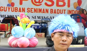 Jadi taman mini belum buka, lalu taman mini di buka tgl 20 April, kemudian dengan adanya sanggar topeng, saya mencoba masuk hal yang baru, topengnya kepala orang yang lucu, terus pake sarung “ternyata org ko semua ketawa?” Akhirnya bagaimana supaya semua orang banyak tertawa, saya tambahin perut, tambahin pantat akhirnya namanya “Badut” Badannya Gendut. Jadilah awal mula badut.